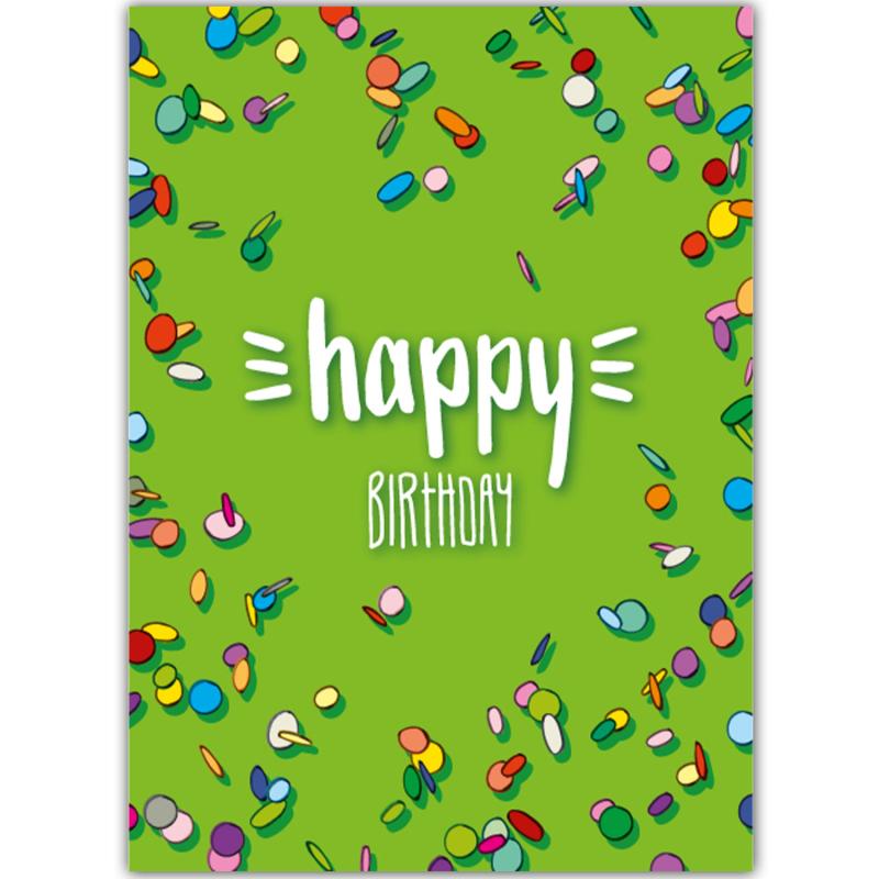 Ansichtkaart Habi is een vrolijke verjaardagskaart met een speels confettipatroon in frisse kleuren. Tegen de heldergroene achtergrond staat de tekst Happy Birthday centraal, waardoor de kaart direct feestelijk en uitnodigend aanvoelt. Een tijdloos ontwerp dat geschikt is voor jong en oud en perfect past bij een verjaardag met kleur en plezier.