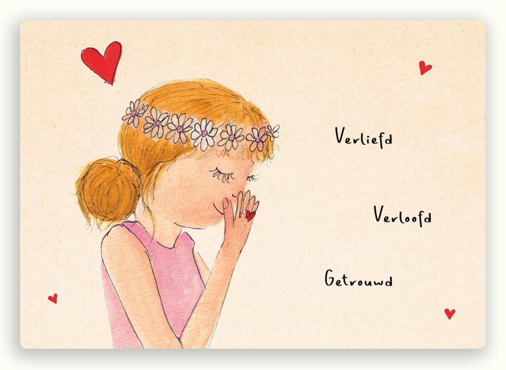 Verliefd, verloofd… en zo gelukkig! Op deze lieve ZintenZ kaart zie je een meisje dat vol ontroering haar ring bewondert. Een perfect kaartje voor een verloving of bruiloft – vol liefde, eenvoud en een tikkeltje dromerigheid.