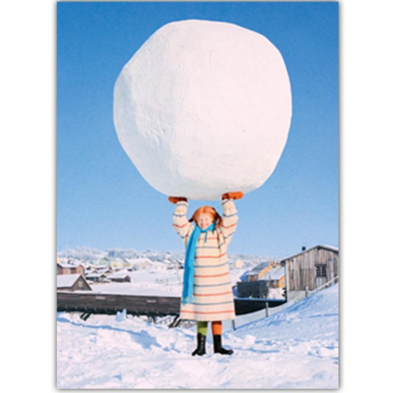 Een gewone sneeuwbal? Niet als het aan Pippi ligt! Op deze winterse fotokaart tilt ze moeiteloos een gigantische sneeuwbal boven haar hoofd – met een grote glimlach natuurlijk. Perfect voor de feestdagen, een wintergroet of gewoon om iemand op te vrolijken met een flinke dosis Pippi-magie.
