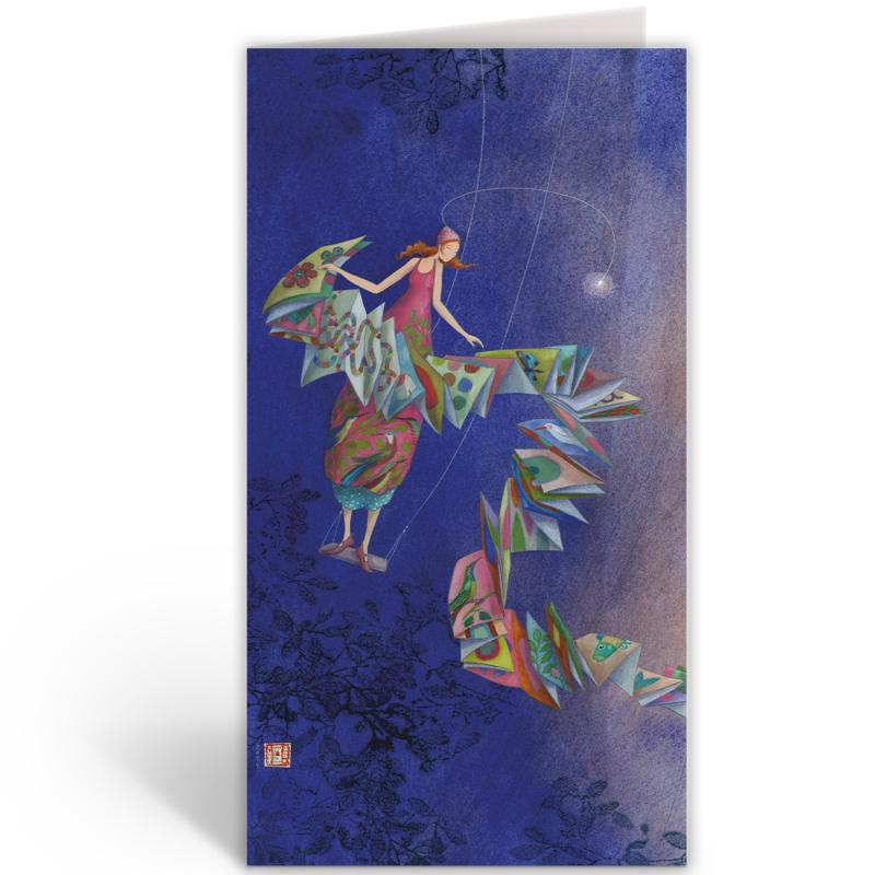 Deze bijzondere dubbele kaart van kunstenares Gaelle Boissonnard is een klein kunstwerk op zich. Het ontwerp ‘Des Histoires’ toont een dromerige figuur in kleurrijke kleding, balancerend tussen verhalen die zich ontvouwen als een lint van illustraties. De diepe blauwtinten en verfijnde details zijn afgewerkt met een waxachtige beschermlaag en subtiele hoogglansaccenten die het geheel een extra luxe uitstraling geven. Perfect om te versturen bij een speciale gelegenheid of om in te lijsten als decoratief object.