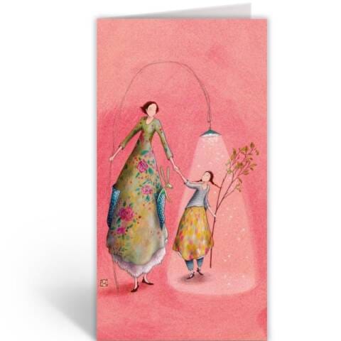 Een kaart die lichtheid en beweging vangt in een poëtisch moment: L’Envolé, ontworpen door de Franse kunstenares Gaëlle Boissonnard. Op een zachte roze achtergrond reikt een sierlijk geklede vrouw naar een mobiel vol papieren vogels – een ode aan dromen, luchtigheid en vrijheid. De langwerpige kaart (10,5 x 21 cm) is afgewerkt met een bijzondere waxachtige laag en glanzende details die de illustratie nog meer tot leven brengen. Een kunstwerk op zich, geleverd met bijpassende envelop.