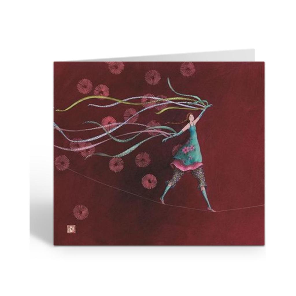 Deze bijzondere wenskaart Ariënne van illustrator Gaëlle Boissonnard toont een dromerig tafereel van een vrouw die over een dun koord loopt terwijl kleurrijke linten sierlijk door de lucht dansen. Tegen de warme roodtinten van de achtergrond ontstaat een speels en poëtisch beeld vol beweging en fantasie.