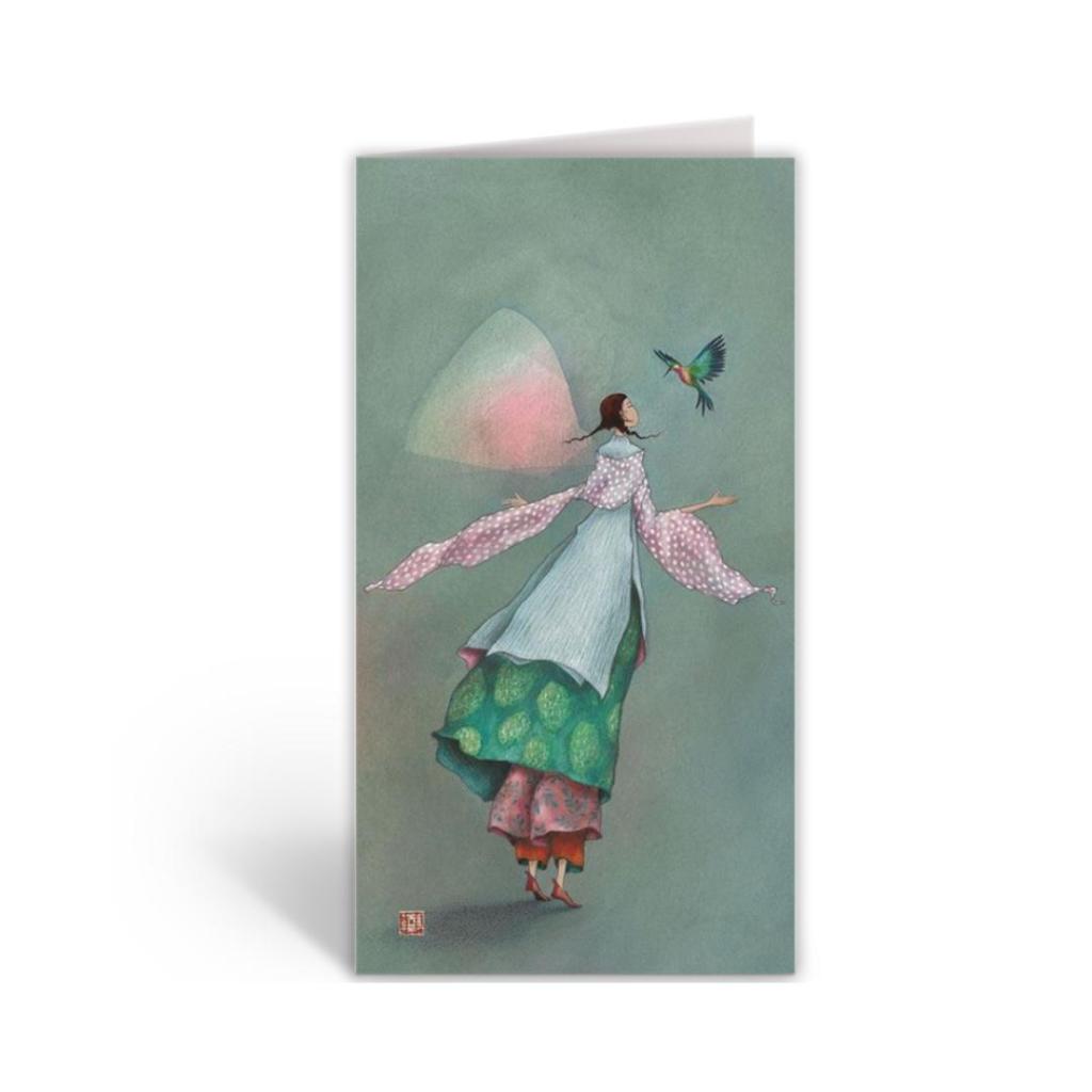 De dubbele kaart L'Envol van Gaëlle Boissonnard toont een licht en poëtisch moment waarin een vrouw haar armen opent naar een kleurrijke vogel die voor haar zweeft. De zachte groentinten en het subtiele licht op de achtergrond geven de illustratie een rustige, dromerige sfeer.