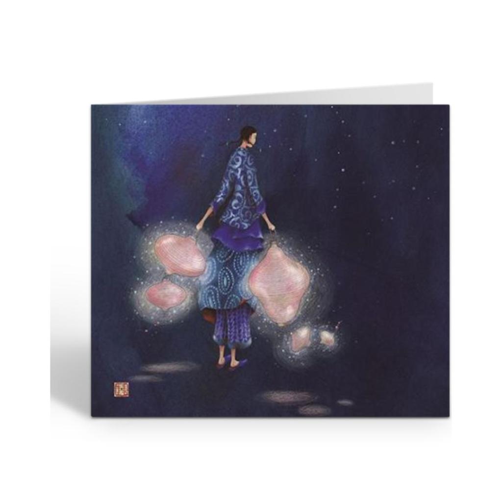 De dubbele kaart Traverser la Nuit van Gaëlle Boissonnard toont een mysterieuze en dromerige nachtelijke scène. Een vrouw zweeft door een donkere sterrennacht terwijl ze zacht gloeiende lampionnen met zich meedraagt. De warme lichtpunten steken prachtig af tegen de diepe blauwtinten van de achtergrond.