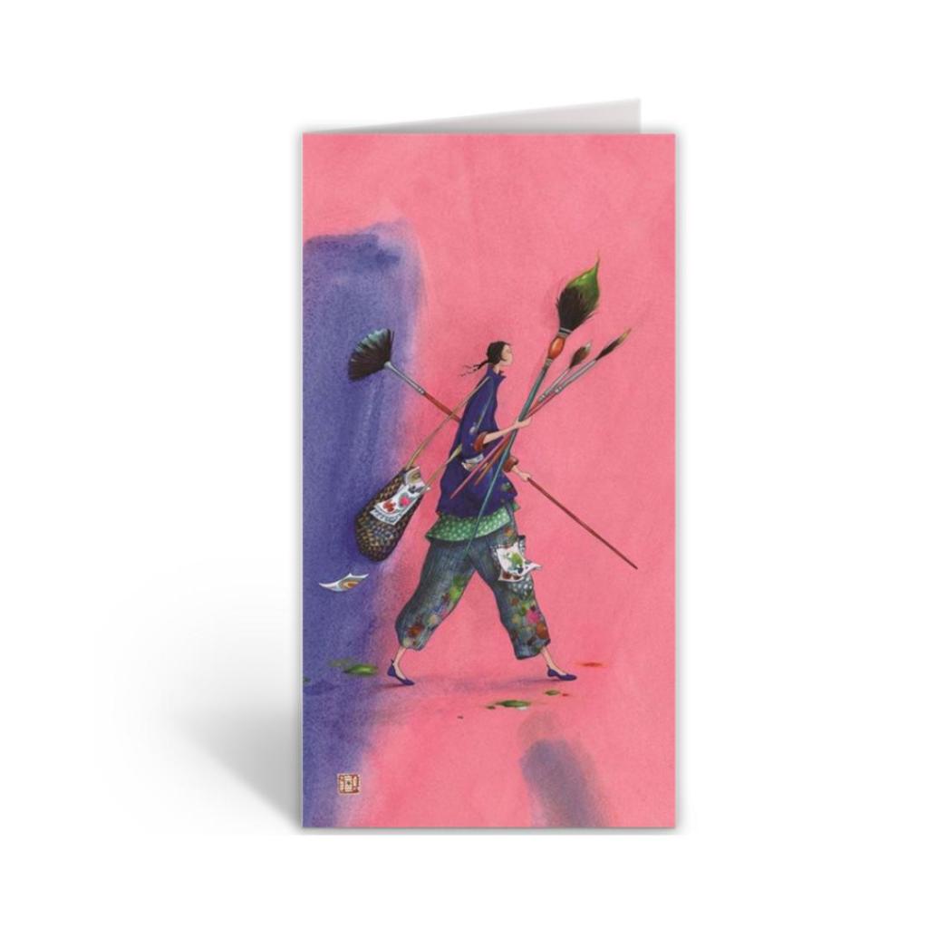De dubbele kaart Vivre en Couleurs van Gaëlle Boissonnard straalt creativiteit en beweging uit. In de illustratie loopt een vrouw met verschillende schilderskwasten en schildermaterialen terwijl de kleurrijke achtergrond een levendig en artistiek geheel vormt.