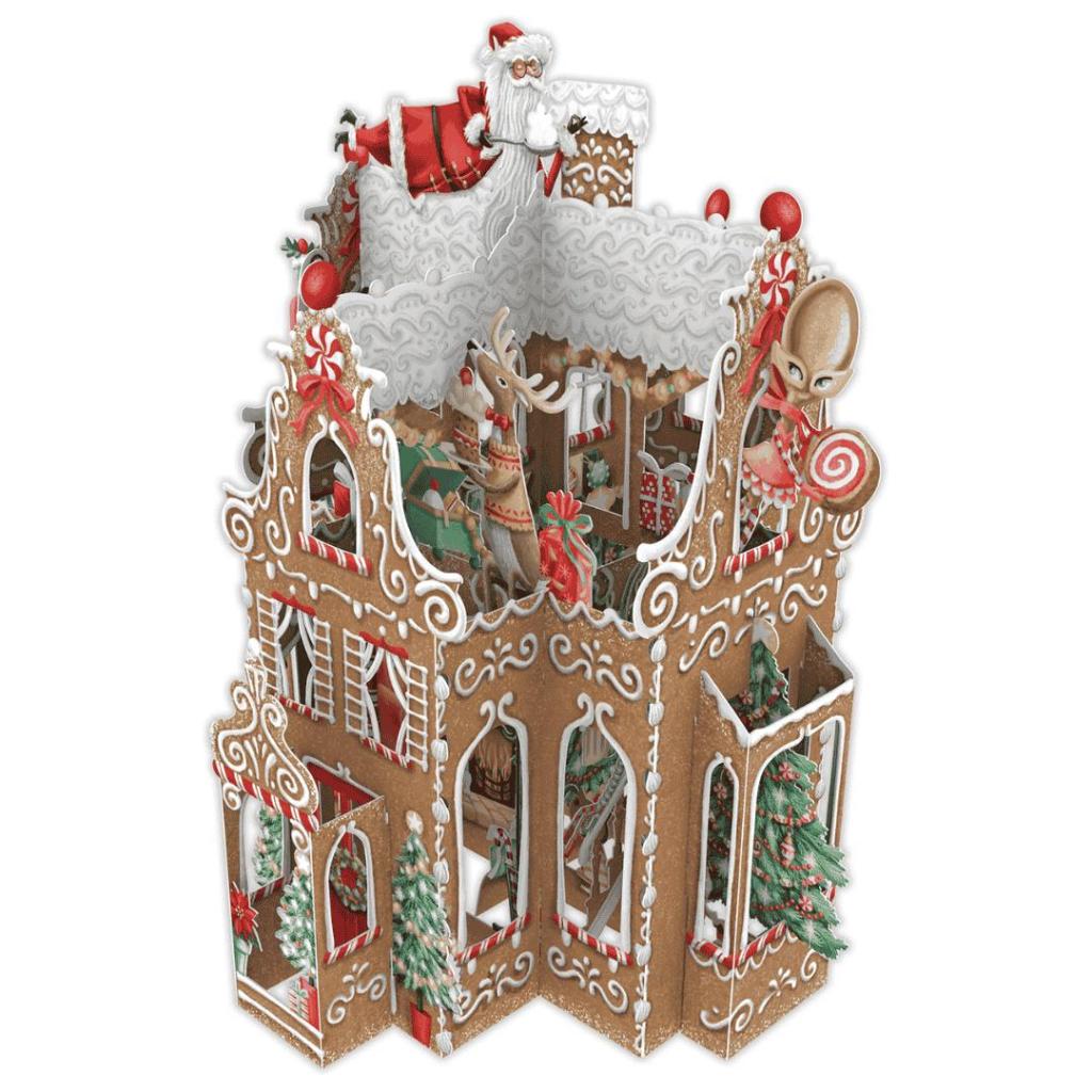 Deze heerlijke 3D wenskaart Gingerbread House is een waar feest voor het oog. Het peperkoekhuis is rijkelijk versierd met sneeuw, zuurstokken en kerstgroen, terwijl de kerstman zich een weg baant via de schoorsteen en rendieren vrolijk door het huis bewegen. Dankzij de lasercut-techniek zijn alle details verfijnd uitgesneden en komt het geheel driedimensionaal tot leven.