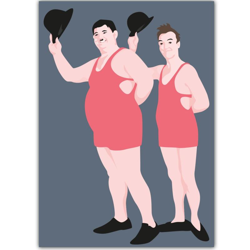 Laurel en Hardy, oftewel De Dikke en de Dunne, zijn op deze ansichtkaart vereeuwigd in charmante pop-art stijl. Gehuld in retro badpakken en met bolhoed in de hand, brengen ze een glimlach op je gezicht – precies zoals ze dat vroeger op het witte doek deden.