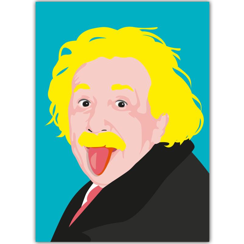 Wie kent hem niet: de geniale natuurkundige met zijn wilde haar en ondeugende blik. Deze ansichtkaart toont Albert Einstein in pop-art stijl, met felgele lokken en zijn iconische pose met uitgestoken tong. Een speelse ode aan één van de grootste denkers aller tijden.