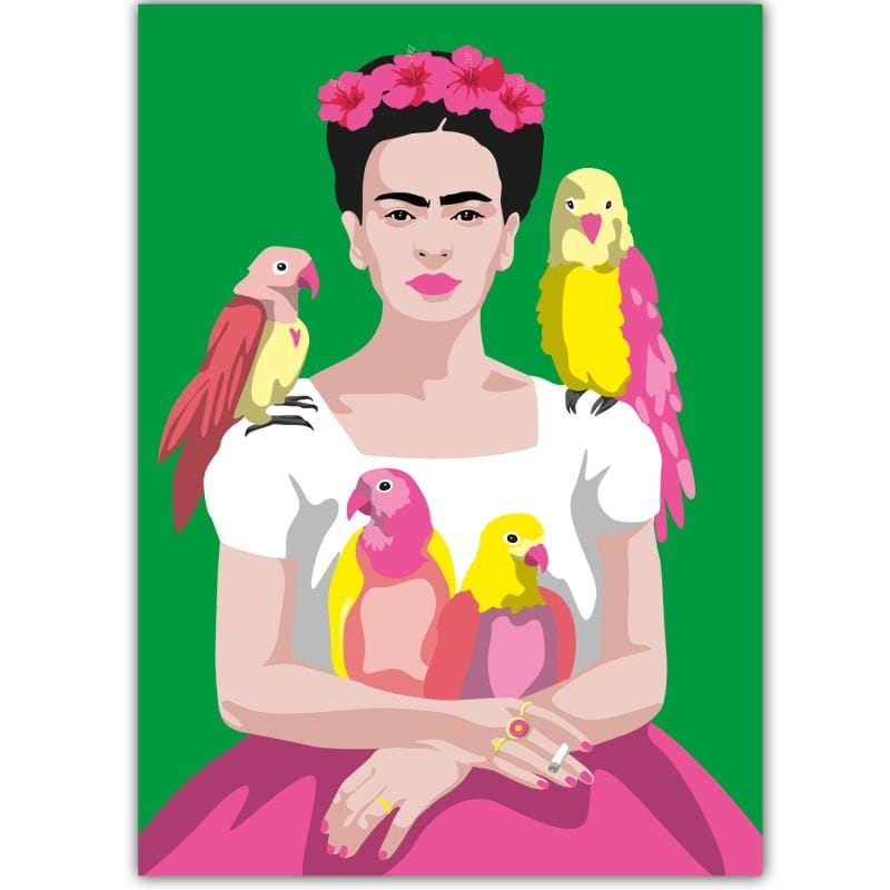 Breng de krachtige en kleurrijke wereld van de legendarische kunstenaar Frida Kahlo in huis met deze prachtige ansichtkaart. De afbeelding toont Frida Kahlo, bekend om haar revolutionaire kunst en unieke stijl, vergezeld door vogels. De aanwezigheid van de vogels, zijn een terugkerend motief in Kahlo's werk.