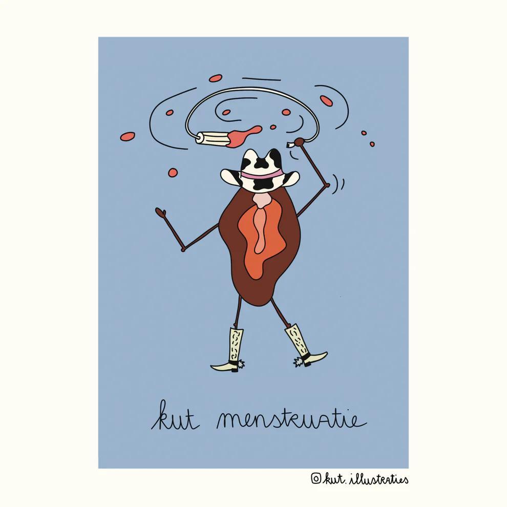 Soms is het gewoon kut. Deze Kut Menstruatie kaart van KUT.illustraties is er voor iedereen die ongesteld is (geworden), zich ellendig voelt of gewoon erkenning zoekt voor hun bloederige realiteit. Met een dansende vulva in cowboylaarzen en een bloedrode tampon in de lucht is deze A6-kaart net zo absurd als herkenbaar. Perfect om te sturen naar je puberdochter, menstruerende BFF, of iemand met een diagnose als endo of adeno. Omdat lachen om ellende soms het beste medicijn is.