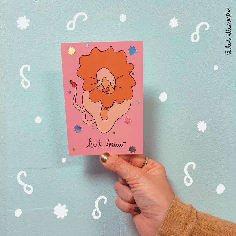 Verras de trotse Leeuw in je leven met de KUT. Kaarten – Kut Leeuw! Deze grappige en gedurfde kaart is een perfecte knipoog naar het sterrenbeeld Leeuw. Met een opvallende holografische afwerking en een speels ontwerp is deze kaart ideaal om iemand aan het lachen te maken en een glimlach op hun gezicht te toveren. De kaart is gemaakt van stevig sulfaatkarton en FSC-gecertificeerd papier, wat zorgt voor een milieuvriendelijke keuze. Het compacte A6-formaat biedt voldoende ruimte voor een persoonlijke boodschap en maakt het de perfecte keuze voor verjaardagen, grappige momenten of zomaar een onverwachte verrassing.