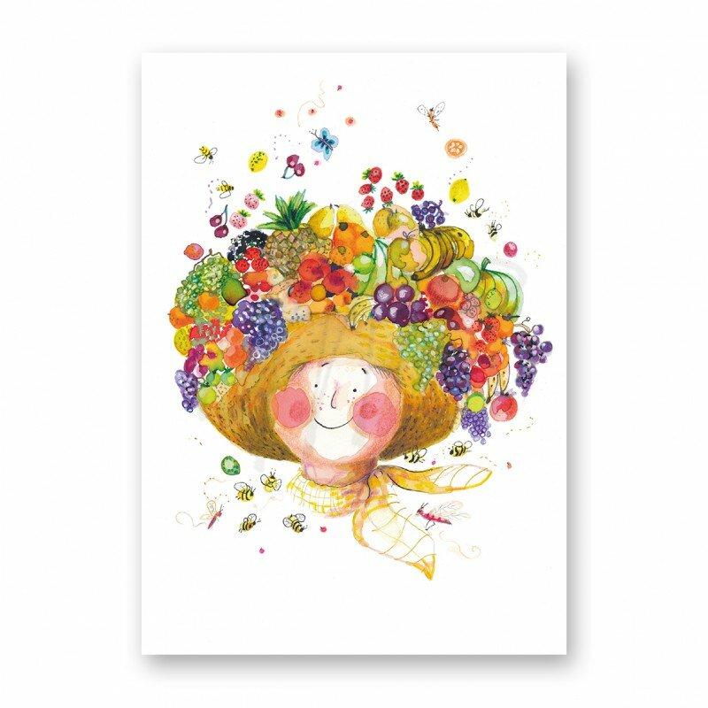 Breng kleur en vrolijkheid in iemands dag met Fruity Hat! Deze speelse illustratie toont een lachend gezicht met een uitbundige hoed van sappig fruit, van druiven en ananas tot kersen en bessen. Bijen en vlinders dartelen eromheen, waardoor de kaart een zomerse, zorgeloze sfeer uitstraalt. Perfect voor een opbeurende groet of als zonnige verrassing voor iemand die wel wat kleur kan gebruiken!