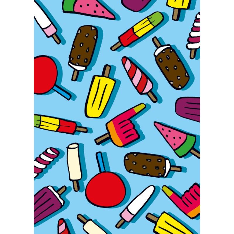 Ansichtkaart Hielo is een speelse en kleurrijke kaart vol geïllustreerde ijsjes in allerlei vormen en kleuren. De frisse blauwe achtergrond en het herhalende patroon geven de kaart een zomerse, vrolijke uitstraling. Perfect om te sturen als felicitatie, vrolijke groet of gewoon zomaar.