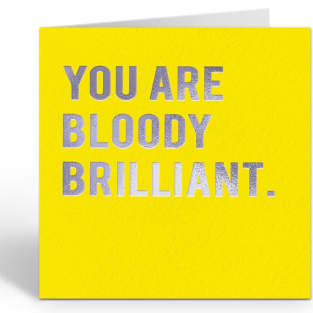 Deze opvallende wenskaart zegt het gewoon zoals het is: “You are bloody brilliant.” De felle gele achtergrond gecombineerd met zilverkleurige folie-opdruk zorgt voor een frisse, energieke uitstraling die meteen een glimlach oproept. Een perfecte kaart om iemand een welverdiend compliment te geven — recht uit het hart, met Britse humor.