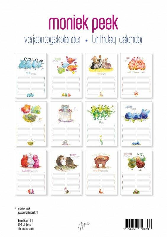 Met de Moniek Peek Verjaardagskalender Dieren vergeet je nooit meer een verjaardag. Deze sfeervolle kalender is prachtig geïllustreerd door kunstenares Moniek Peek, bekend om haar verfijnde aquarellen van bloemen en planten. Iedere maand wordt opgesierd met een unieke, gedetailleerde dierenillustratie, passend bij de sfeer van het seizoen. Word iedere maand blij van een vrolijke dierentafereel. Van pinguins tot kippen, vrolijke kikkers en schattige beren. Zo word iedere verjaardag een feestje.