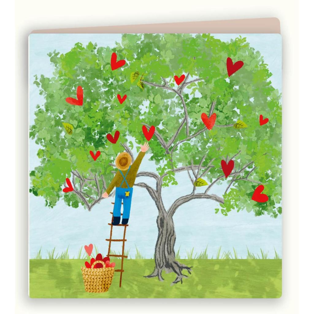 Een sfeervolle kaart met een grote boom vol rode hartjes en een persoon op een ladder die ze plukt. Een warm en symbolisch beeld over liefde, aandacht en kleine geluksmomenten.