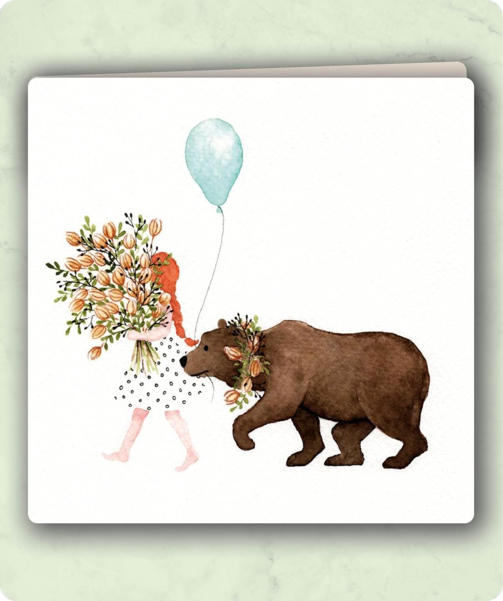 Een dromerige en hartverwarmende Zintenz dubbele kaart met een illustratie van een meisje dat hand in hand wandelt met een beer. Een beeld dat rust, vriendschap en verwondering uitstraalt. Perfect om iemand een liefdevol bericht te sturen, als felicitatie of gewoon als mooi gebaar.