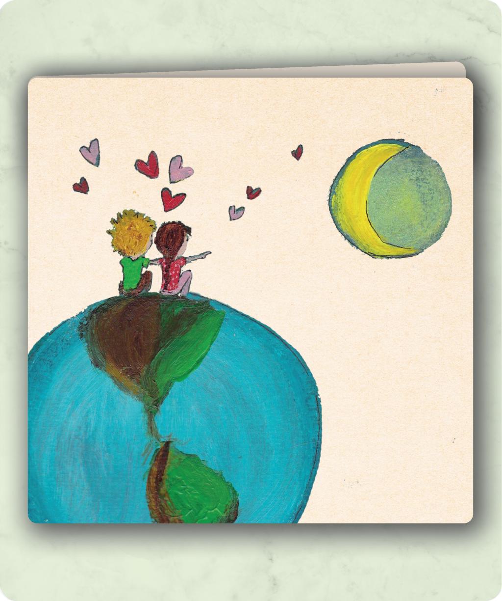 Een sfeervolle en liefdevolle kaart met twee kinderen die samen op de wereld zitten en naar de maan kijken. De kleine hartjes in de lucht geven de kaart een warme, dromerige uitstraling – perfect voor een persoonlijke en lieve boodschap.