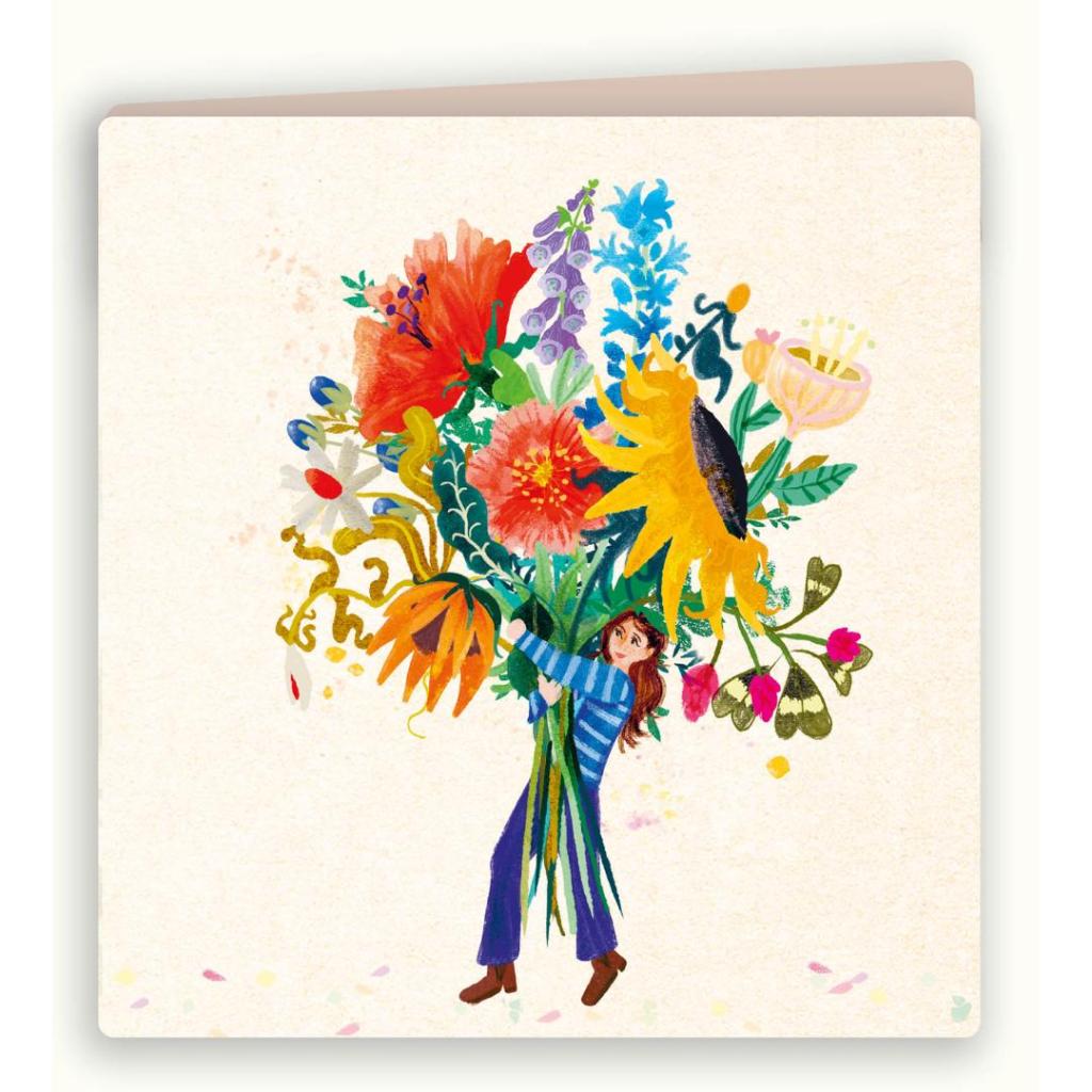Een speelse en kleurrijke kaart met een vrouw die een enorme bos bloemen vasthoudt. Een vrolijk beeld dat meteen een feestelijk en positief gevoel geeft.