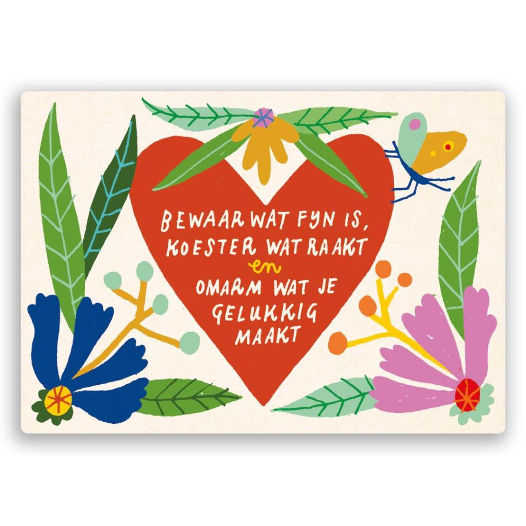 Een warme postkaart met een groot hart, omringd door bloemen en de tekst “Bewaar wat fijn is, koester wat raakt en omarm wat je gelukkig maakt”. Een liefdevolle kaart voor een bijzonder moment.