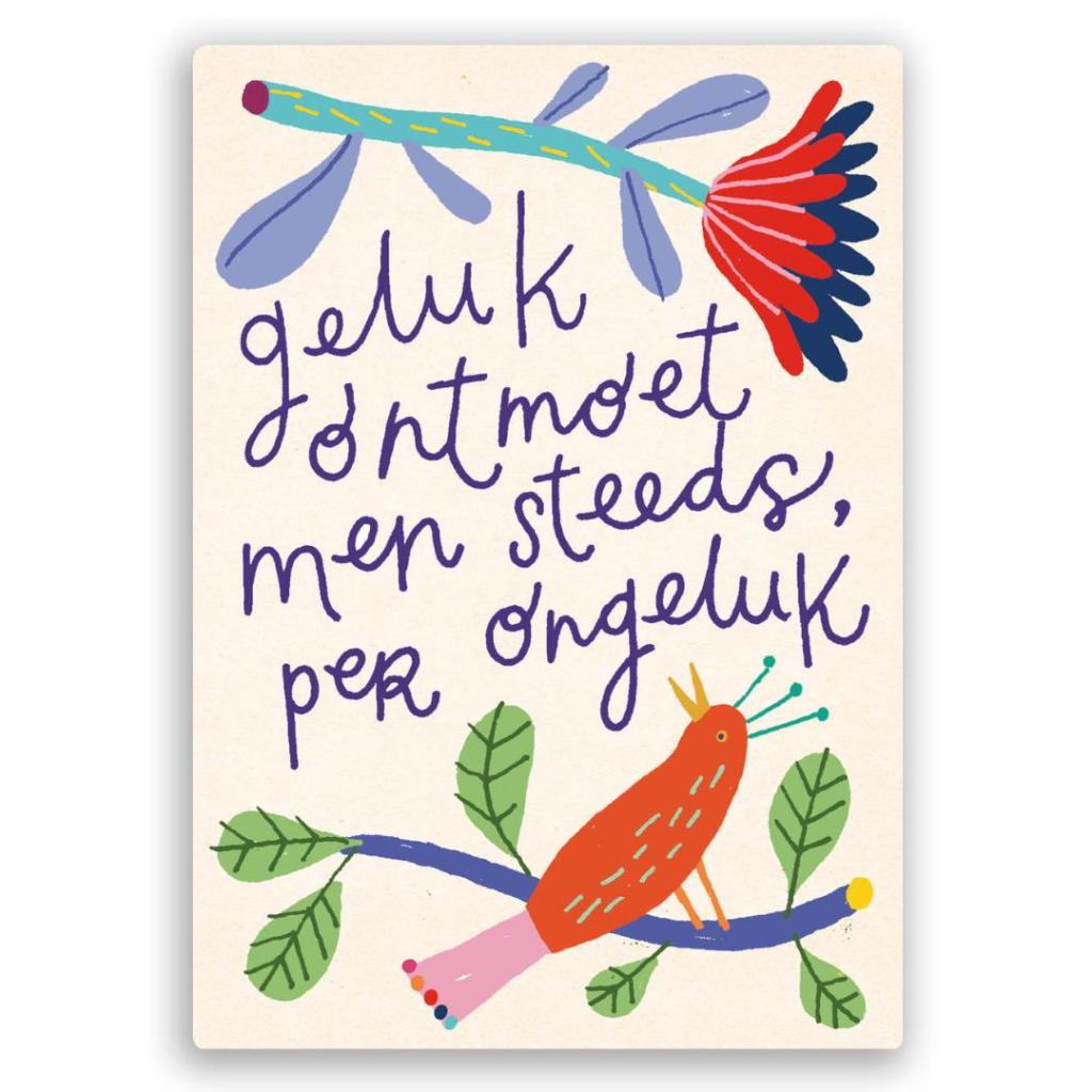 Een speelse postkaart met een vogel en de tekst “Geluk komt met steeds per ongeluk”. Een luchtige en positieve boodschap die laat zien dat geluk vaak onverwacht ontstaat.