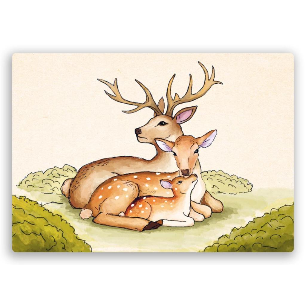 Een lieve postkaart met een hertenfamilie: een hert, een hinde en een jong reekalf dicht tegen elkaar aan. Een warm beeld dat staat voor liefde, bescherming en verbondenheid.