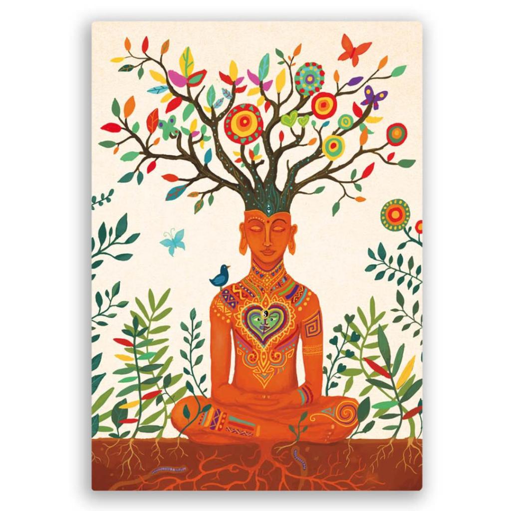 Een bijzondere postkaart met een mediterende figuur waaruit een boom groeit. De illustratie symboliseert innerlijke rust, groei en verbondenheid met de natuur.