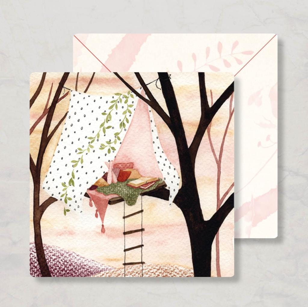 Droom weg bij deze sfeervolle Zintenz postkaart met een prachtig geïllustreerde boomhut. Een perfect kaartje om iemand een moment van rust en ontspanning toe te wensen of gewoon als decoratie voor jezelf. Gedrukt met plantaardige bio-inkt op 100% gerecycled papier, een bewuste en duurzame keuze met een warme uitstraling.