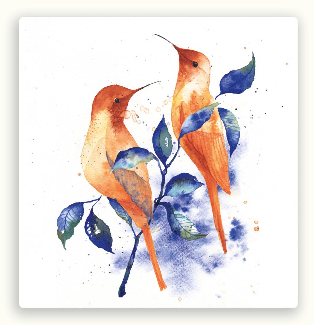 Een sfeervolle kaart van Zintenz met een aquarelillustratie van twee vogels op een tak met blauwe bladeren. De warme oranje tinten en zachte penseelstreken geven deze kaart een gevoel van rust en verbondenheid — perfect om iemand een liefdevolle boodschap of bemoedigend woord te sturen.