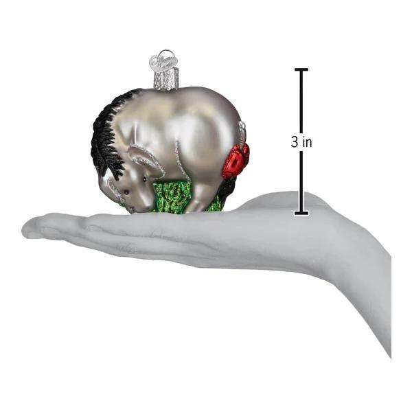 Breng een vleugje melancholische charme in je kerstboom met dit schitterende Eeyore ornament van Old World Christmas. Deze met de hand geblazen en met de mond beschilderde kerstbal toont het geliefde ezeltje uit Winnie de Poeh, compleet met zijn iconische rode strik aan zijn staart. Gemaakt van glas en rijkelijk versierd met glitters, straalt dit ornament nostalgie en vakmanschap uit. Een must voor Disney-liefhebbers, verzamelaars of iedereen die een glimlach aan de boom wil hangen. Hoogte: ca. 7,6 cm.