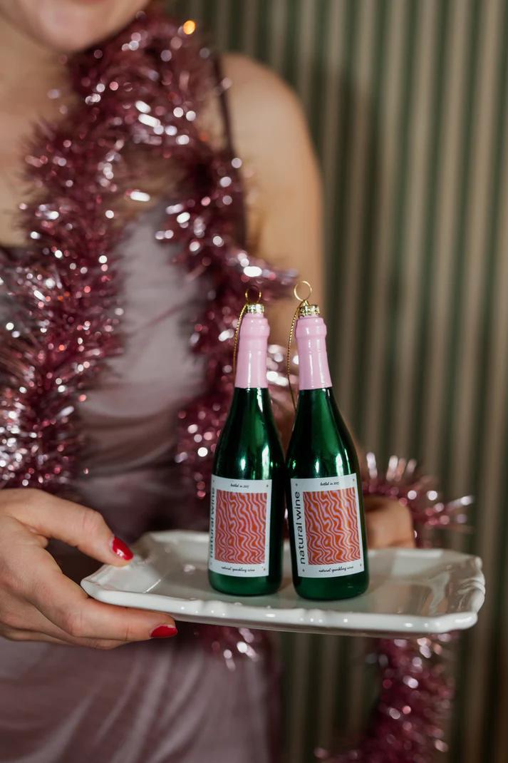 Proost! Deze glazen kerstbal in de vorm van een fles natuurwijn is het perfecte ornament voor wie houdt van een goed glas én een vleugje humor in de kerstboom. De glanzend groene fles met roze dop en retro etiket brengt instant feeststemming. Met de hand gemaakt en beschilderd door Yup in de Boom – elk detail, van de kurk tot het label, zit vol karakter. Een originele toevoeging aan de feesttafel of als cadeau voor de wijnliefhebber in je leven.