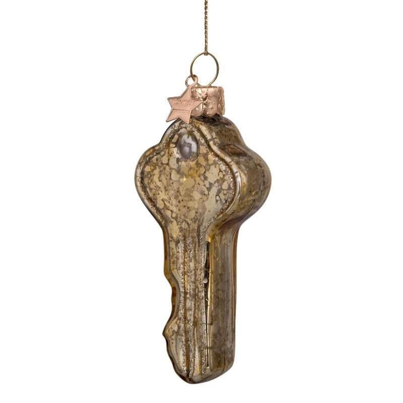 Deze bijzondere kerstbal van Vondels is vormgegeven als een gouden huissleutel en draagt de tekst New Home. Een symbolisch ornament dat staat voor een nieuw begin, verhuizen of samen een nieuw hoofdstuk starten. De glanzende goudtinten en subtiele glitters geven de sleutel een luxe, warme uitstraling.