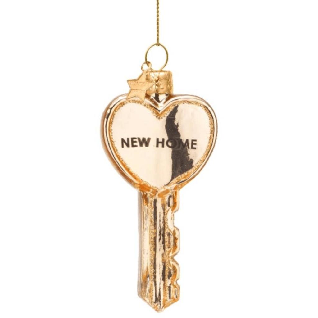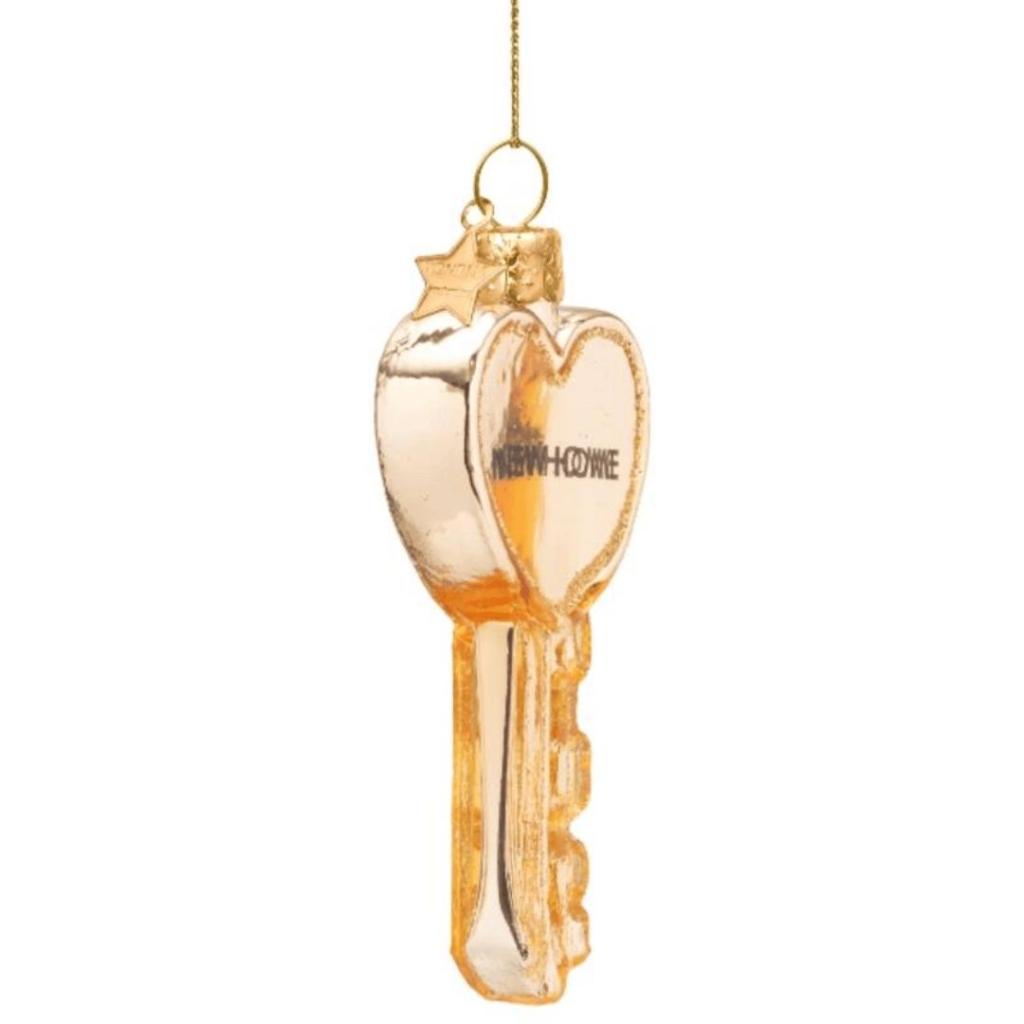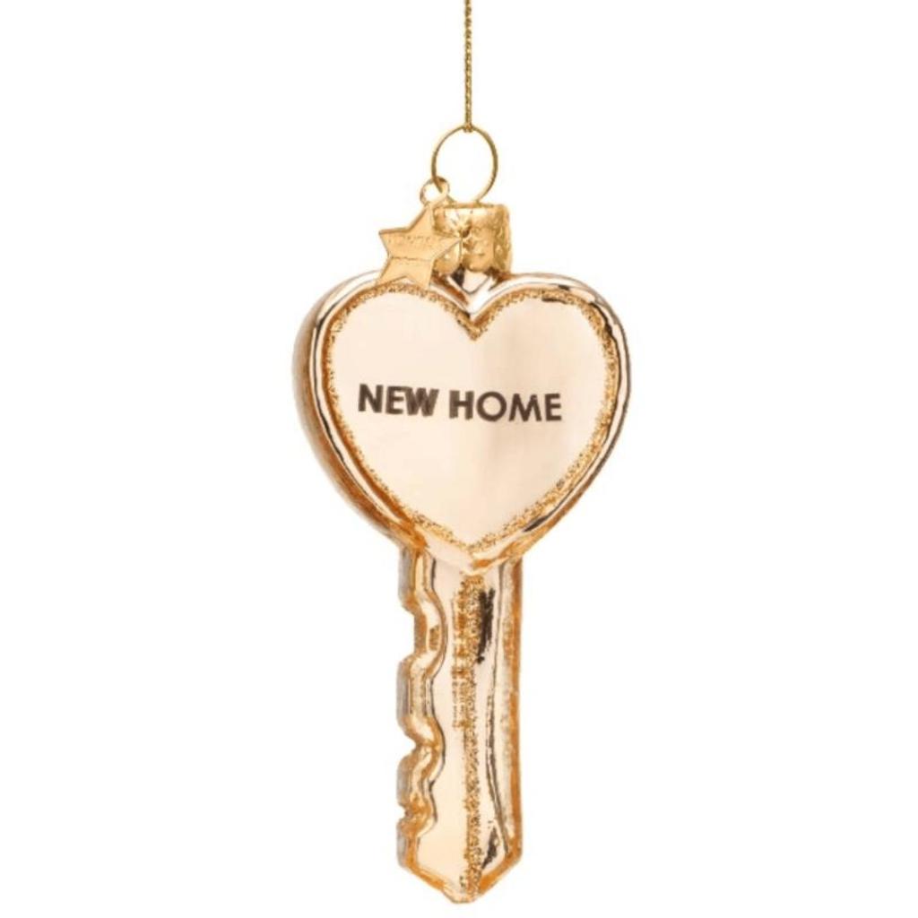 Kerstbal Huissleutel Hart – Gouden glazen ornament met “New Home”-tekst (H. 8,5 cm)