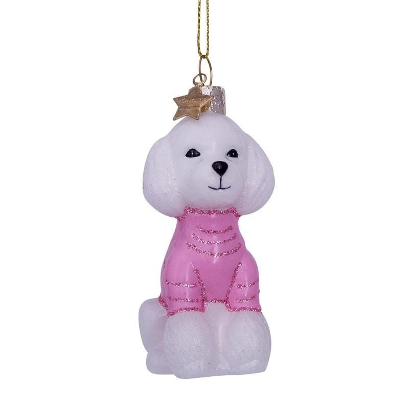 Poedels worden vaak geassocieerd met luxe en rijkdom, maar wist je dat Poedels eigenlijk jachthonden zijn? Omdat ze goede zwemmers zijn kwamen ze goed van pas bij de jacht op watervogels. Deze Witte Poedel van Vondels is op jacht naar een mooie kerstboom. Het hondje heeft hiervoor zijn mooiste Roze T-shirt al aangetrokken. Haal jij hem in huis? Deze Kerstbal hebben we ook in het Geel en Blauw