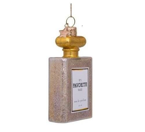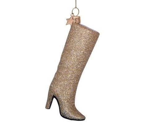 Inhoud: 3 ornamenten: Parfum Fles met Glitters, Damestas Gouden Glitters, Laars Goud Glitters
