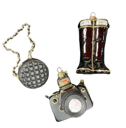 Inhoud: 3 kerstballen: Damestas Rond Zwar, Laarzen Zwart, Fotocamera