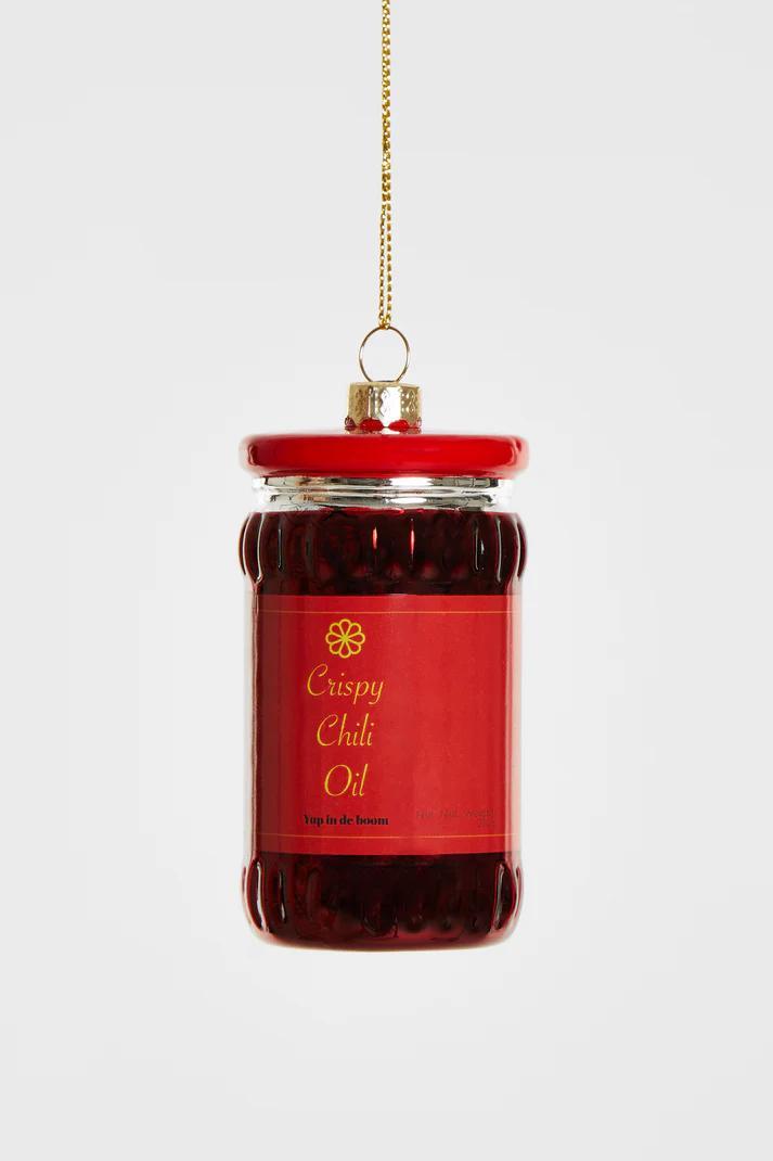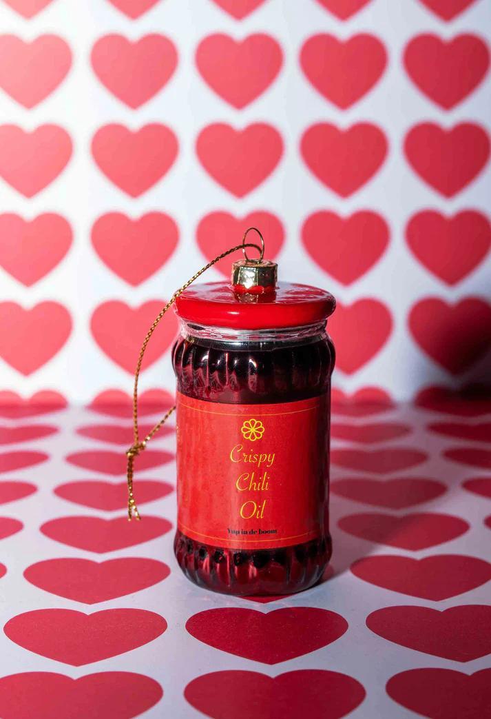Voor wie van pit houdt – letterlijk én figuurlijk. Deze glazen kerstbal in de vorm van een pot Crispy Chili Oil brengt kruidige warmte in je kerstboom. De realistische details, het glanzende rode deksel en het vurige label maken dit ornament een echte blikvanger. Elk exemplaar is handgemaakt en handbeschilderd, wat zorgt voor een unieke en speelse toevoeging aan je kerstcollectie. Perfect voor foodies, thuiskoks en iedereen die houdt van originele kerstdecoratie met smaak.