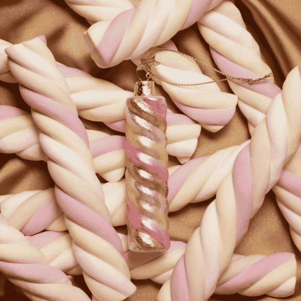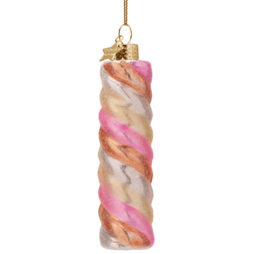 Zeg maar dag tegen saaie kerstballen – dit glazen spekkie van Vondels is een snoepje voor het oog! Met z’n gedraaide roze, witte en goudkleurige lijnen lijkt het net echt. Zoet, vrolijk en nét even anders.