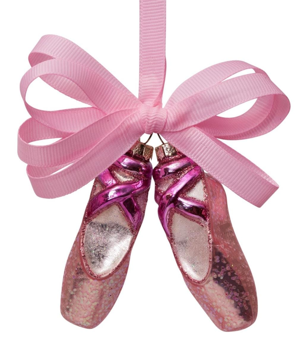 Welke ballerina wil deze kerstbal nou niet in haar kerstboom hebben hangen. De spitzen waarop je de mooiste pirouettes kan draaien geven je ook de ergste blaren. Gehaat en geliefd; maar altijd symbool voor één van de mooiste kunstvormen; de dans. Dit glazen ornament van Vondels is bij elkaar gebonden met een vierdubbele roze strik.