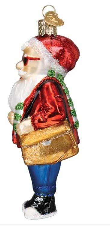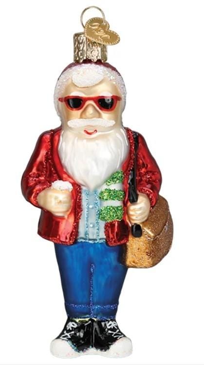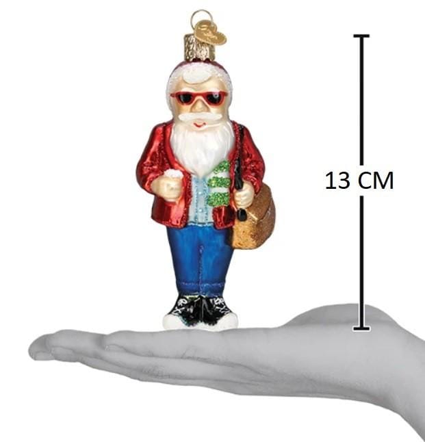 Wanneer de Kerstman geen cadeautjes hoeft te bezorgen draagt hij graag een andere outfit. Een spijkerbroek en een hippe, rode zonnebril. Lopend op zijn zwarte gympen geniet hij van zijn koffie to go. Is deze Hipster Kerstman onderweg naar jouw kerstboom?