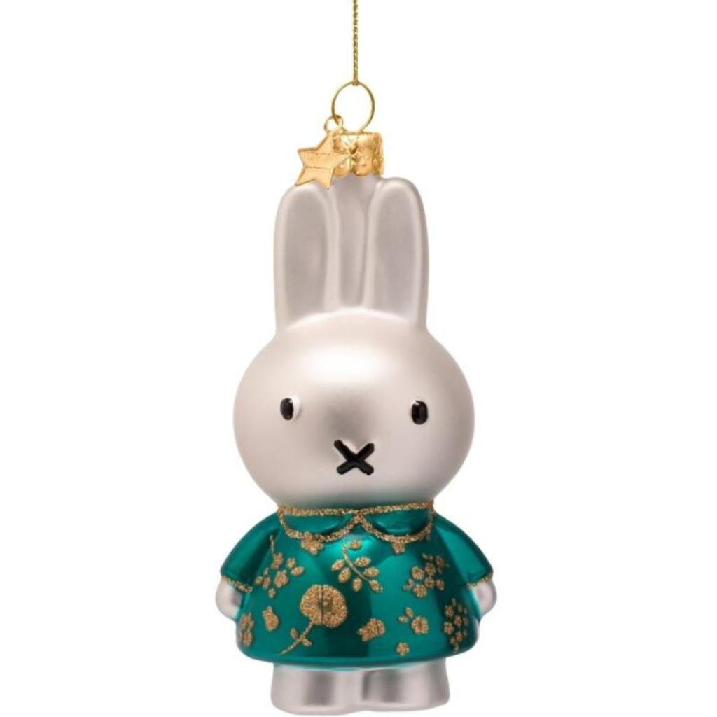 Vier de feestdagen met een vleugje Nederlandse nostalgie dankzij deze betoverende kerstbal van Vondels. Het iconische figuurtje Nijntje schittert in een glanzende groene jurk, rijkelijk versierd met gouden bloemmotieven. Met de hand geblazen en met de hand beschilderd van hoogwaardig glas, is dit ornament een charmante toevoeging aan elke kerstboom. De gouden ophanglus met ster maakt het helemaal af.