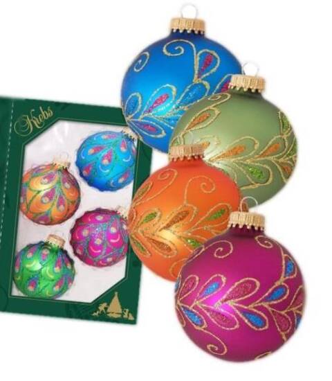Prachtige set van vier grote retro kerstballen. De ballen met ieder een eigen kleur hebben een puntige deuk naar binnen wat voor een mooi licht schouwspel zorgt. De buitenkant bewerkt met een zilver decoratie laagje. een set waar je oma jaloers op zou zijn, want vroeger.....