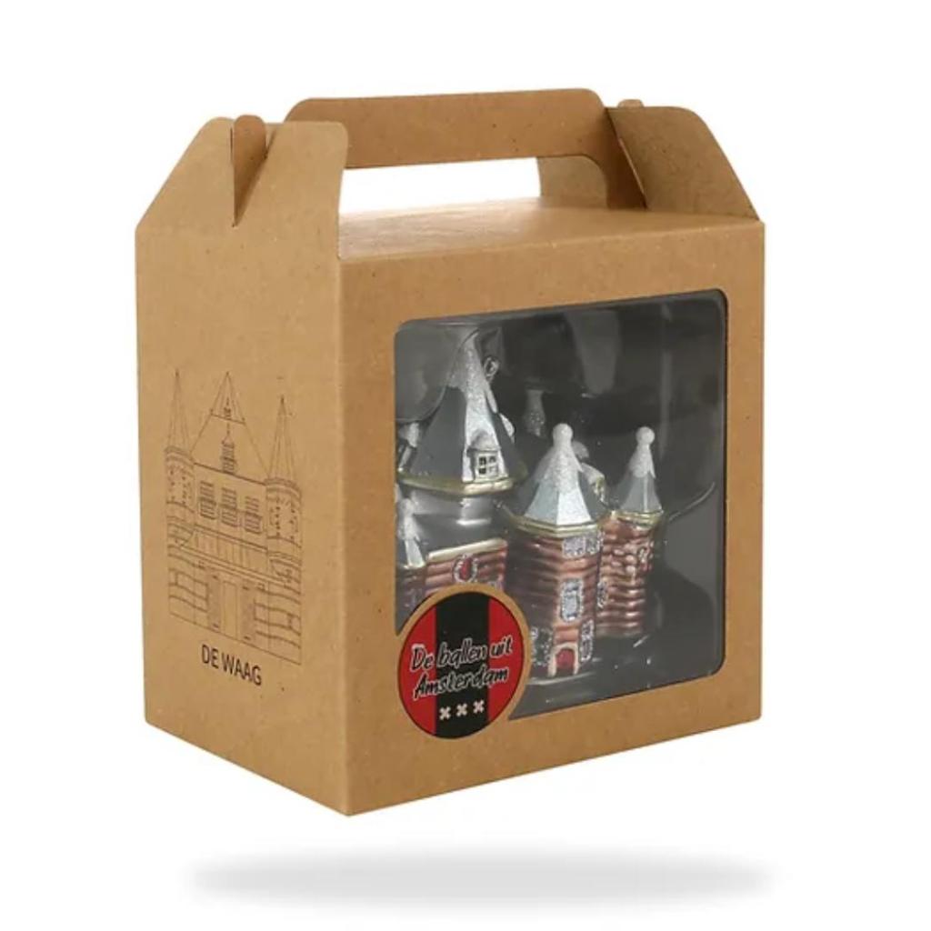 De Kerstbal De Waag is een waar kunstwerkje voor in je kerstboom. Geïnspireerd op het historische gebouw in Amsterdam, toont dit glazen ornament prachtige details, zoals de iconische torens en de glanzende koper- en zilverkleurige afwerking. Een stijlvolle blikvanger die Nederlandse geschiedenis en kerstmagie samenbrengt. Geleverd in een luxe vensterdoos voor bescherming of cadeauverpakking.