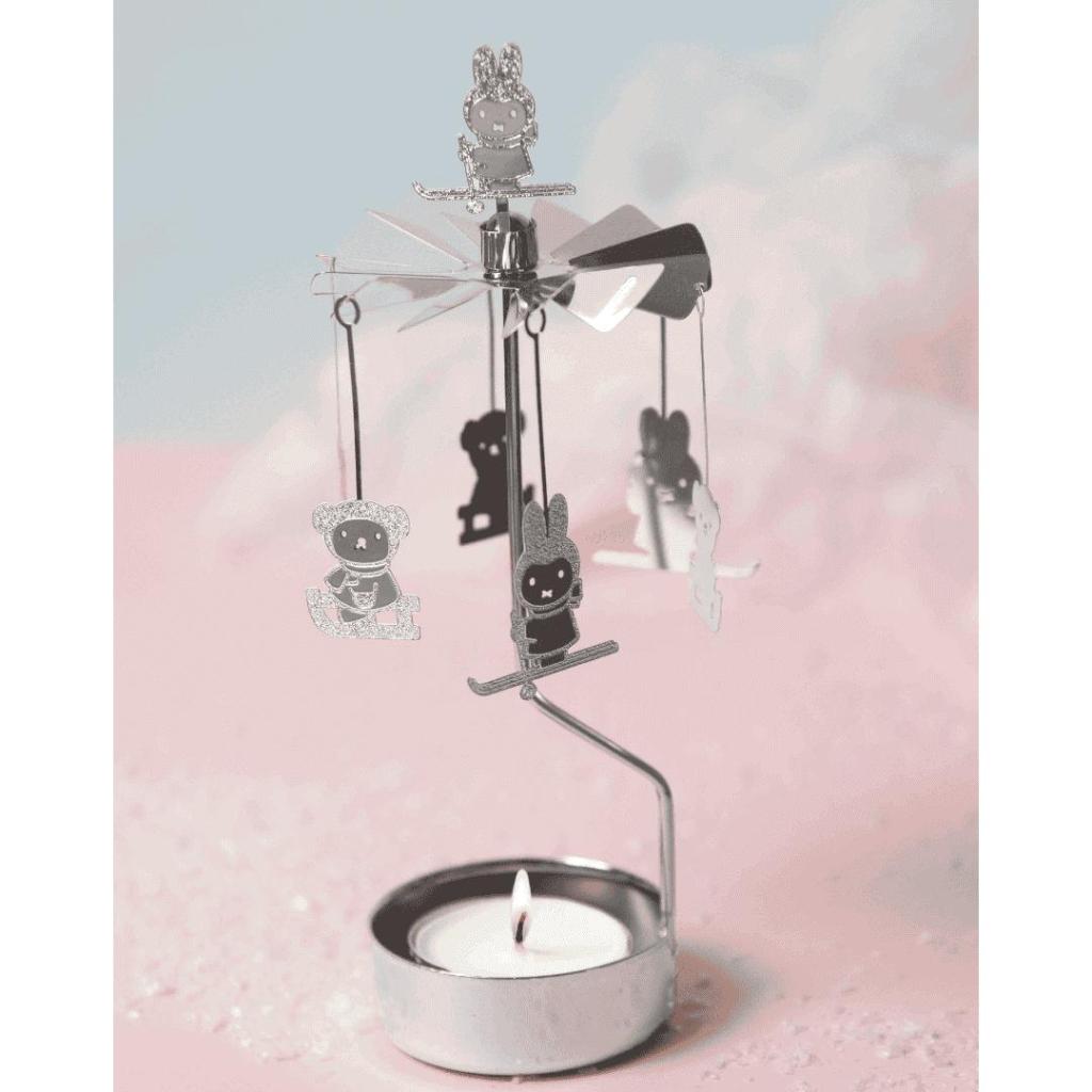 De Angel Chimes Nijntje Winter van Pluto Design brengt direct een gezellige winterse sfeer in huis. Zodra je het theelichtje aansteekt, begint de metalen waaier te draaien en komen de zilverkleurige hangers – waaronder Nijntje op ski’s en Boris op de slee – zachtjes in beweging. Een knus winters tafereel dat perfect past bij het seizoen.
