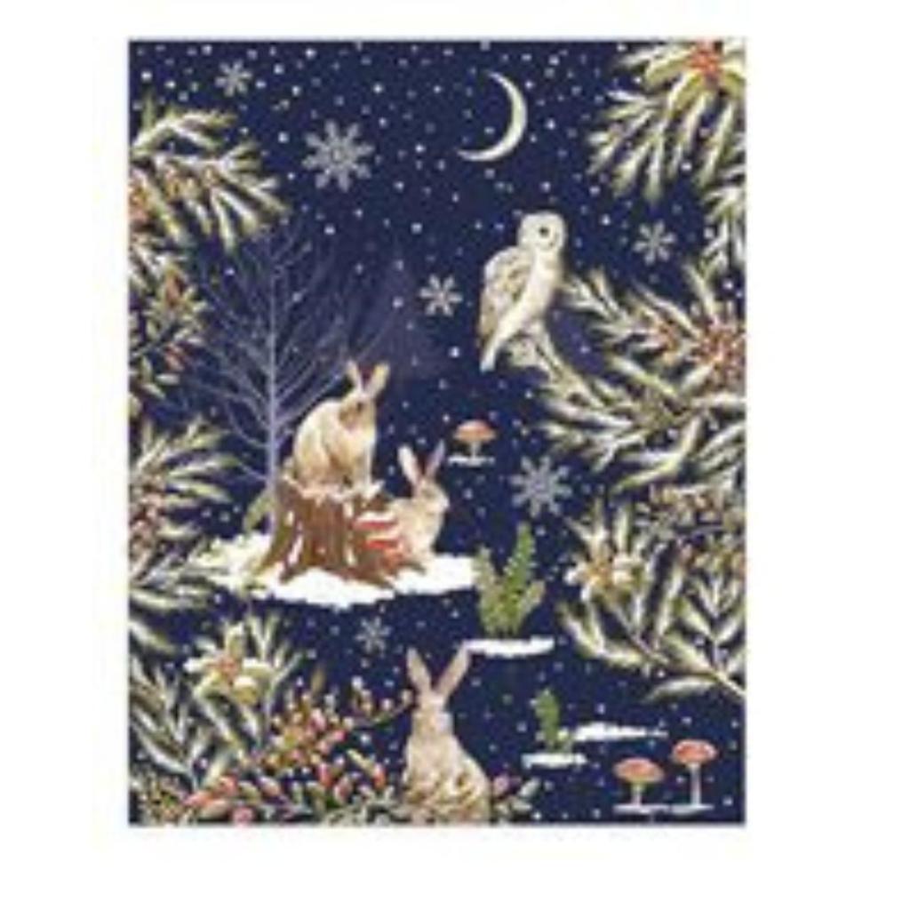 Terwijl de maan zacht schijnt over het winterbos, huppelen drie konijntjes door de sneeuw — met een oplettende uil die van boven toekijkt. Een kaart vol wintermagie, perfect om iemand een warme kerstgroet te sturen.