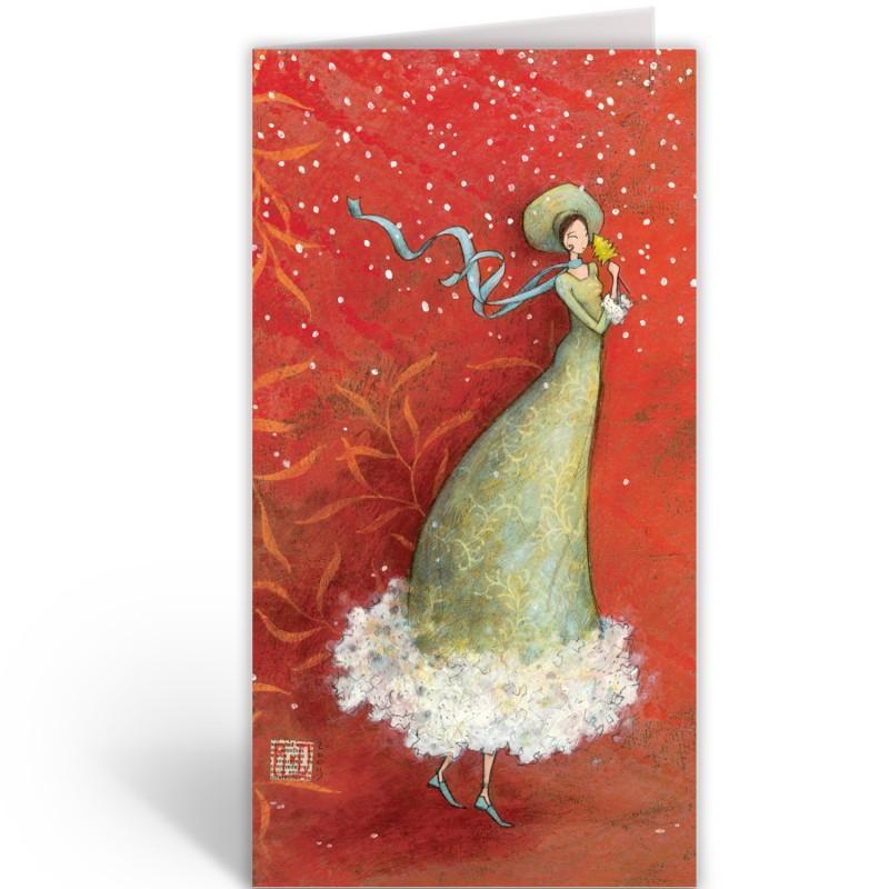De dubbele kerstkaart Snow van Gaelle Boissonnard straalt warmte en elegantie uit. De illustratie toont een vrouw in een lichtgroene jurk met een lange blauwe sjaal, wandelend door een sneeuwbui tegen een dieprode achtergrond. De zachte kleuren en fijne details brengen de winterse sfeer prachtig tot leven.