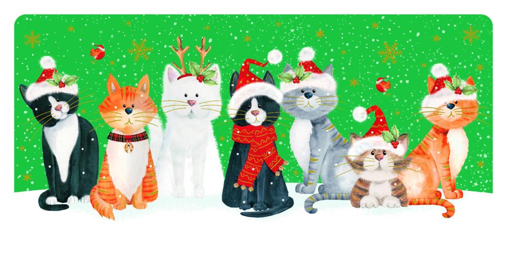 Een vrolijke kerstkaart voor echte kattenliefhebbers. Zeven charmante katten zitten keurig in het rijtje, ieder met een eigen kerstoutfit: van kerstmutsen en sjaaltjes tot hulstkransen en zelfs rendiergewei-oren. De felgroene achtergrond met dwarrelende sneeuw en gouden sterren maakt het geheel speels en feestelijk.