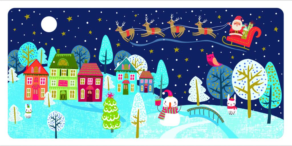 Een sfeervolle kerstkaart met een magisch wintertafereel: de Kerstman vliegt met zijn arrenslee vol cadeaus over een vrolijk gekleurd dorpje, terwijl sneeuwpoppen en dieren rustig in de nacht staan te kijken. De heldere sterrenhemel maakt de kaart extra feestelijk en warm.