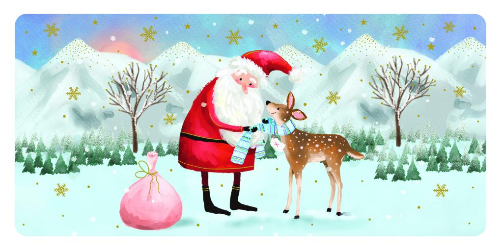 Postkaart Les Enchantées – Kerstman met Hert in Winterlandschap