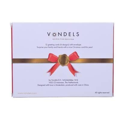 Verras je familie en vrienden met deze prachtige kaarten van Vondels. Dit pakket bevat 12 kaarten in 6 designs, inclusief 12 enveloppen. Op de kerstkaarten staan de ornamenten van Vondels afgebeeld.